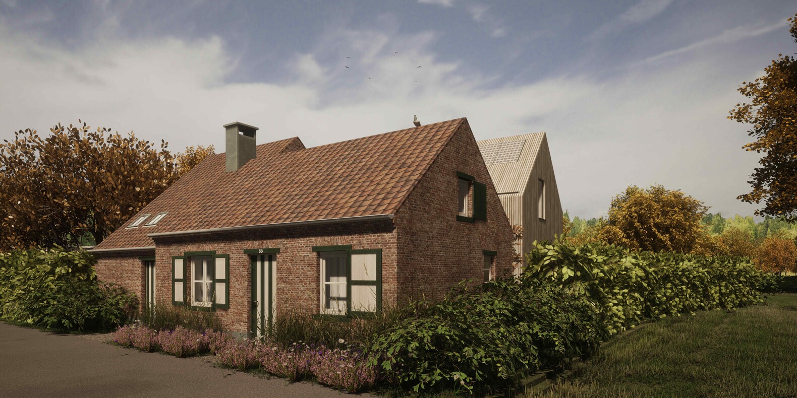 Het project streeft naar het terugbrengen van het oorspronkelijke bocagelandschap en creëert een zichtas naar de achterzijde van het terrein met een natuurlijk streekgebonden element als uitkijkpunt. Groene buffers rondom het bestaande woonstalhuis verbergen het nieuwe achterliggende volume in het straatbeeld terwijl het bestaande groen maximaal behouden blijft.
