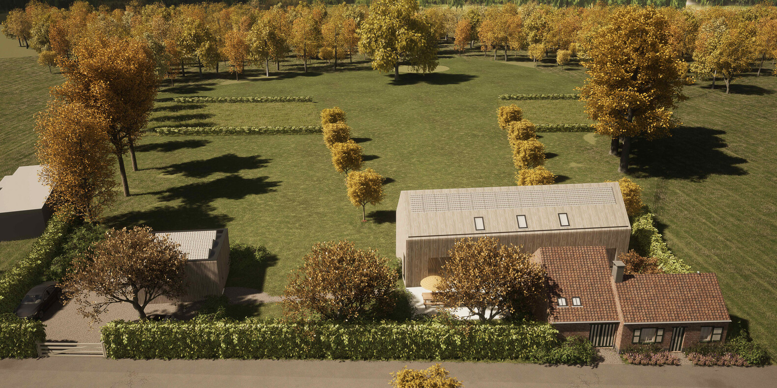 Het project streeft naar het terugbrengen van het oorspronkelijke bocagelandschap en creëert een zichtas naar de achterzijde van het terrein met een natuurlijk streekgebonden element als uitkijkpunt. Groene buffers rondom het bestaande woonstalhuis verbergen het nieuwe achterliggende volume in het straatbeeld terwijl het bestaande groen maximaal behouden blijft.
