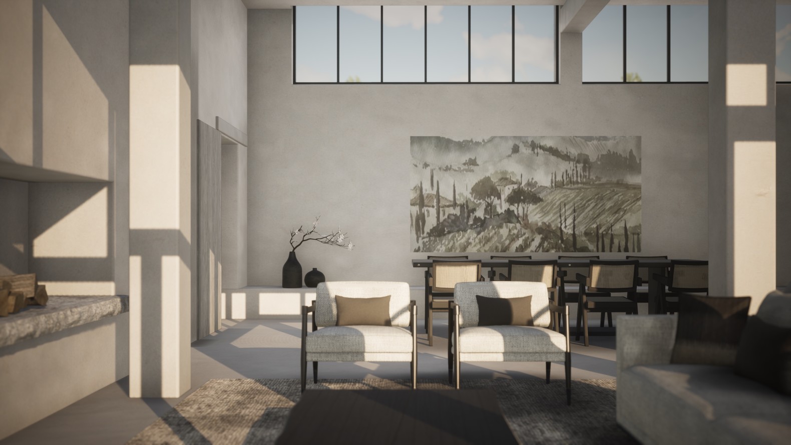Het ontwerpconcept hanteert een moderne en minimalistische benadering, waarin warmte en industriële ruwheid in harmonie samenkomen. De kenmerkende betonnen draagstructuur geeft het interieur zijn karakteristieke en doorleefde uitstraling, terwijl strakke lijnen en een monochroom kleurenpalet een tijdloze elegantie creëren. De subtiel toegevoegde donkere accenten bieden een delicate balans in de ruime loft.