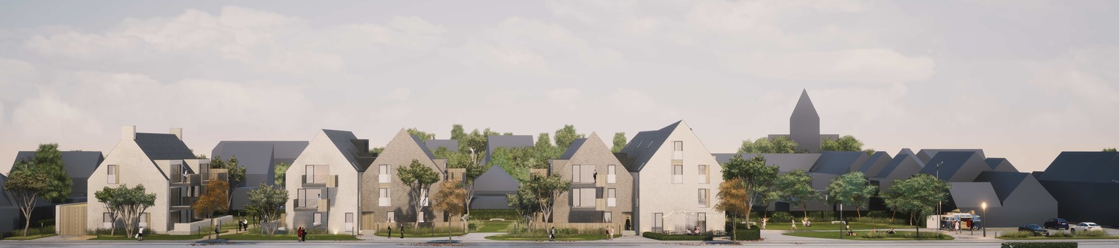 Het straatbeeld van het nieuwe project werd gebaseerd op het typische dorpsprofiel dat zo herkenbaar is van de verkeersborden die de bebouwde kom aanduiden. Als reactie op de monotone ‘muur’ die zou worden gevormd door de huizen van de verkaveling, werd ervoor gekozen om de drie bouwblokken optisch op te delen in 5 speels ingeplante fragmenten, waarvan de verspringende puntgevels variëren in kroonlijsthoogte, dakbasis en gevelmateriaal. Deze hedendaagse interpretatie van de manier waarop het dorp groeide, vermijdt de saaie ritmiek van de verkaveling waarin alles artificieel afgelijnd is volgens één rechte bouwlijn en één doorlopende kroonlijst.